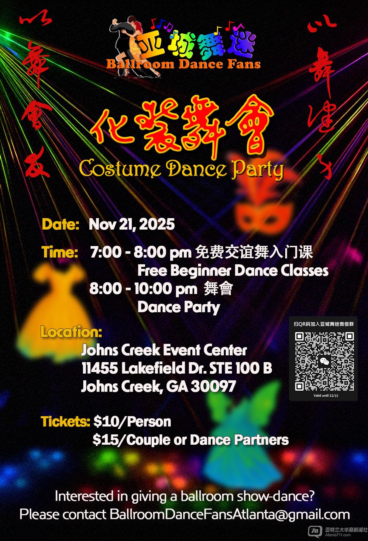 秋风凉爽,秋叶争艳,我们又将如约而至 -- “亚城舞迷”将于11月21日(星期五)晚举办化妆舞会。期待舞友们装扮成喜爱的角色,配戴神秘的面罩,与大家一起享受舞动的快乐,度过一个美好的夜晚!