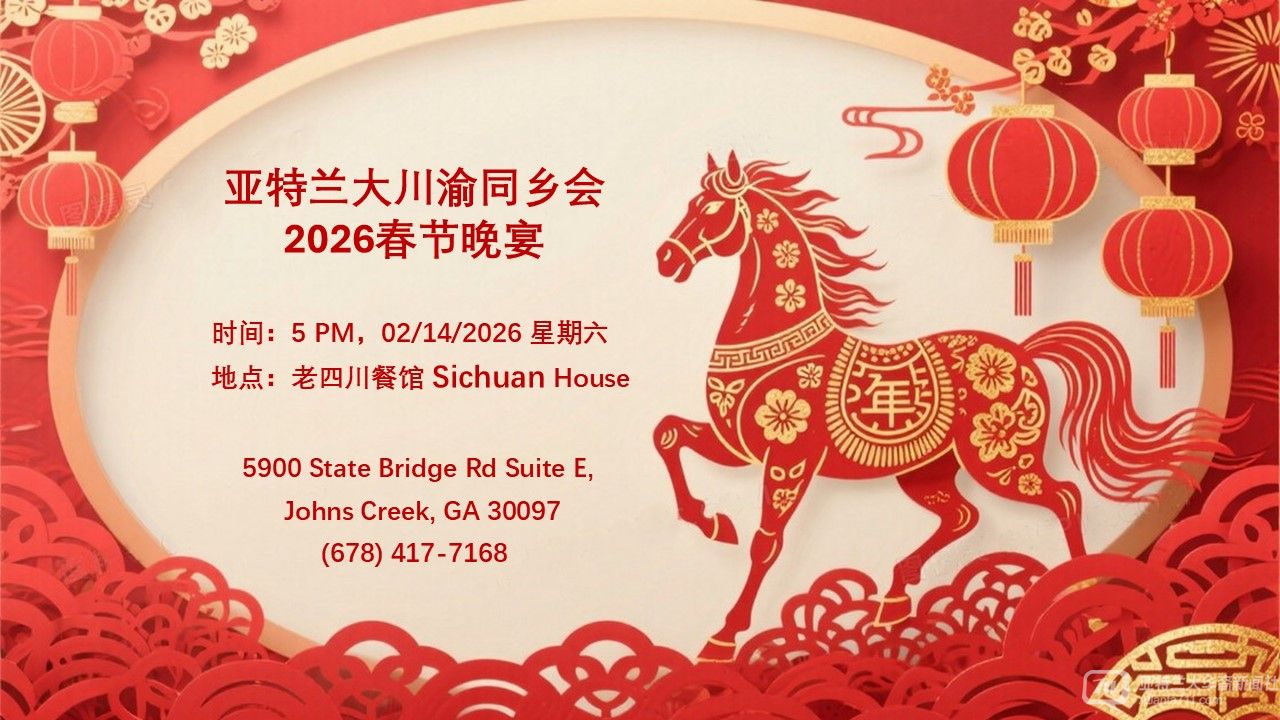 在马年新春佳节来临之际,亚特兰大川渝同乡会诚邀您与家人朋友共聚一堂,喜迎新春!我们将于2月14日(星期六)下午5点,在老四川餐馆举行迎春晚宴,共庆佳节,同享川渝美食,尽叙乡音乡情。